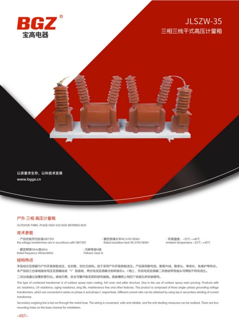 本型组合互感器为户外环氧树脂浇注、全封面、支柱式结构。由于采用户外环氧树脂浇注。产品具有耐电弧、耐紫外线、耐老化、寿命长、免维护等特点。