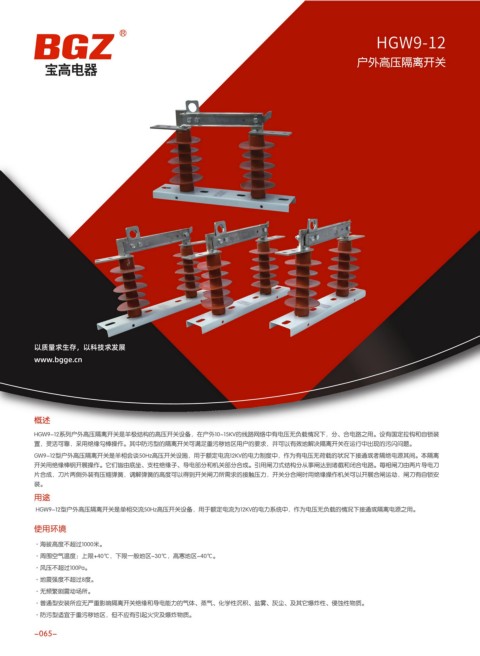 HGW9-12型户外高压隔离开关是单相交流50Hz高压开关设备,用于额定电流为12KV的电力系统中,作为电压无负载的情况下接通或隔离电源之用。